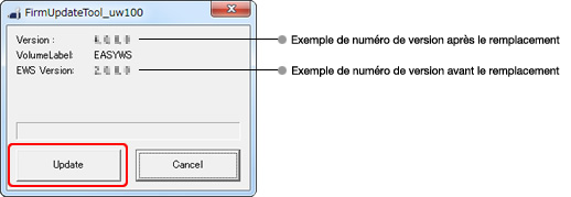3. Vérifiez le numéro de version affiché dans l’écran de confirmation de mise à jour, puis cliquez sur le bouton [Mettre à jour] pour lancer la mise à jour du micrologiciel.