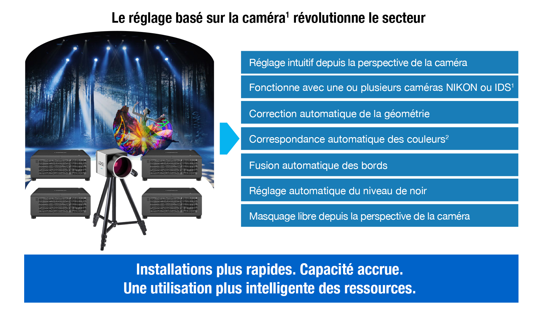 - Correction automatique de la géométrie, fusion, réglage du niveau de noir, correspondance des couleurs3 et fractionnement du contenu2